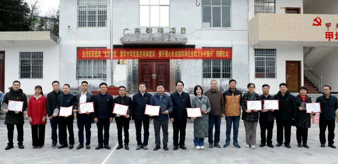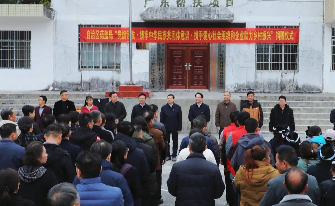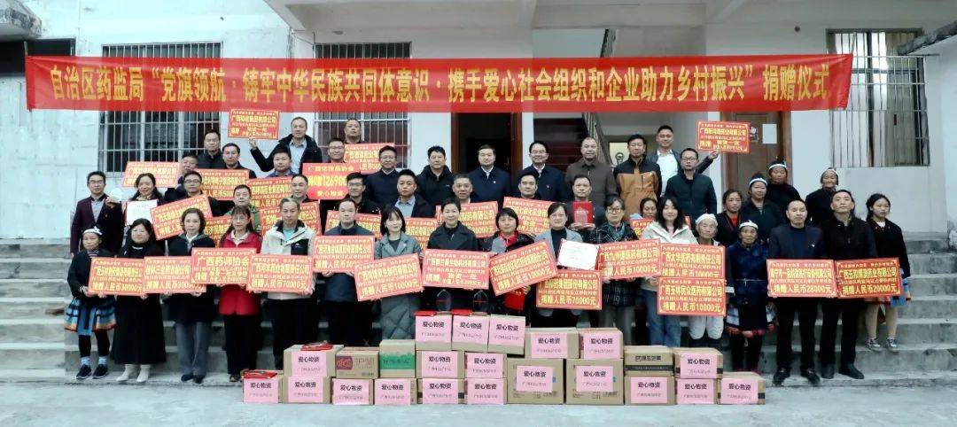 天緣綠集團與廣西醫藥商會、廣西藥師協會、廣西醫療器械行業協會、廣西化妝品協會等眾多單位跟隨廣西壯族自治區藥監局領導攜手共赴南丹縣,開展了以“黨旗領航·鑄牢中華民族共同體意識·攜手愛心社會組織和企業助力鄉村振興”為主題的幫扶捐贈活動。