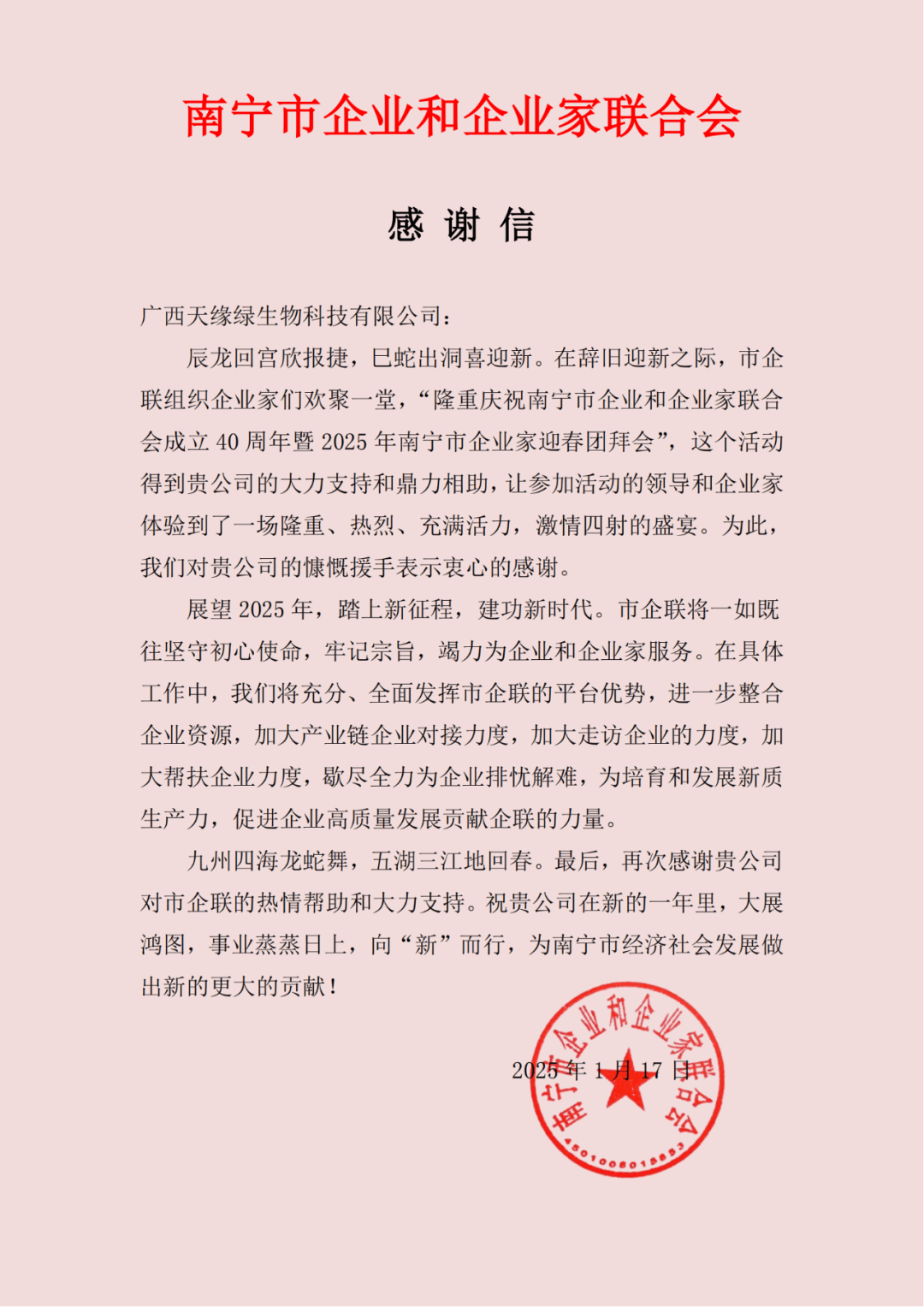 近日,廣西天緣綠科技集團收到了南寧市企業(yè)和企業(yè)家聯(lián)合會(簡稱“南寧市企聯(lián)”)的深情感謝信,信中對天緣綠集團在“南寧市企聯(lián)成立40周年暨2025年南寧市企業(yè)家迎春團拜會”中的慷慨支持與鼎力相助表達了由衷的感激。此次活動在天緣綠集團的助力下,不僅取得了圓滿成功,更讓每一位參與其中的領導和企業(yè)家深切感受到了市企聯(lián)的熱情與蓬勃活力。