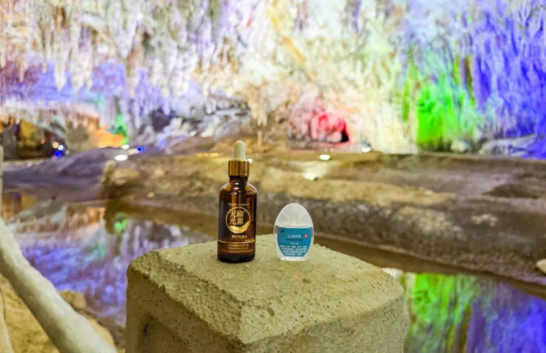 在馬山金倫洞內,鐘乳石在燈光下流轉著七彩光暈,仿佛在訴說著億萬年的自然奧秘。天緣綠集團兩款明星產品——天綠元素與沁潤明眸舒緩滋養護眼液,被輕放在溶洞的天然石臺上。這一刻,科技與自然完成了一場跨越時空的對話。