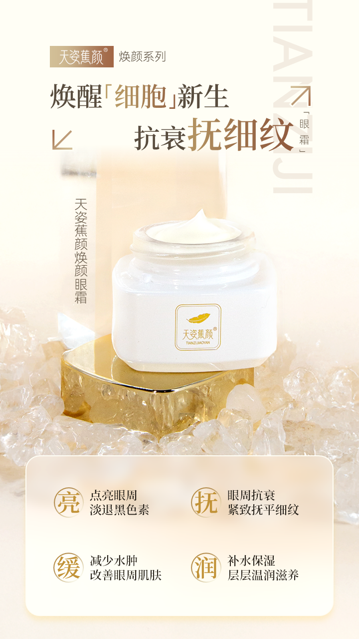 天姿蕉顏煥顏眼霜,蘊含麥角硫因、依克多因、類蛇毒肽等珍貴抗衰修護成分,同時甄選天然植物大蕉果、蘆薈、甘草根、當歸根、山茱萸果等多種植萃精華。